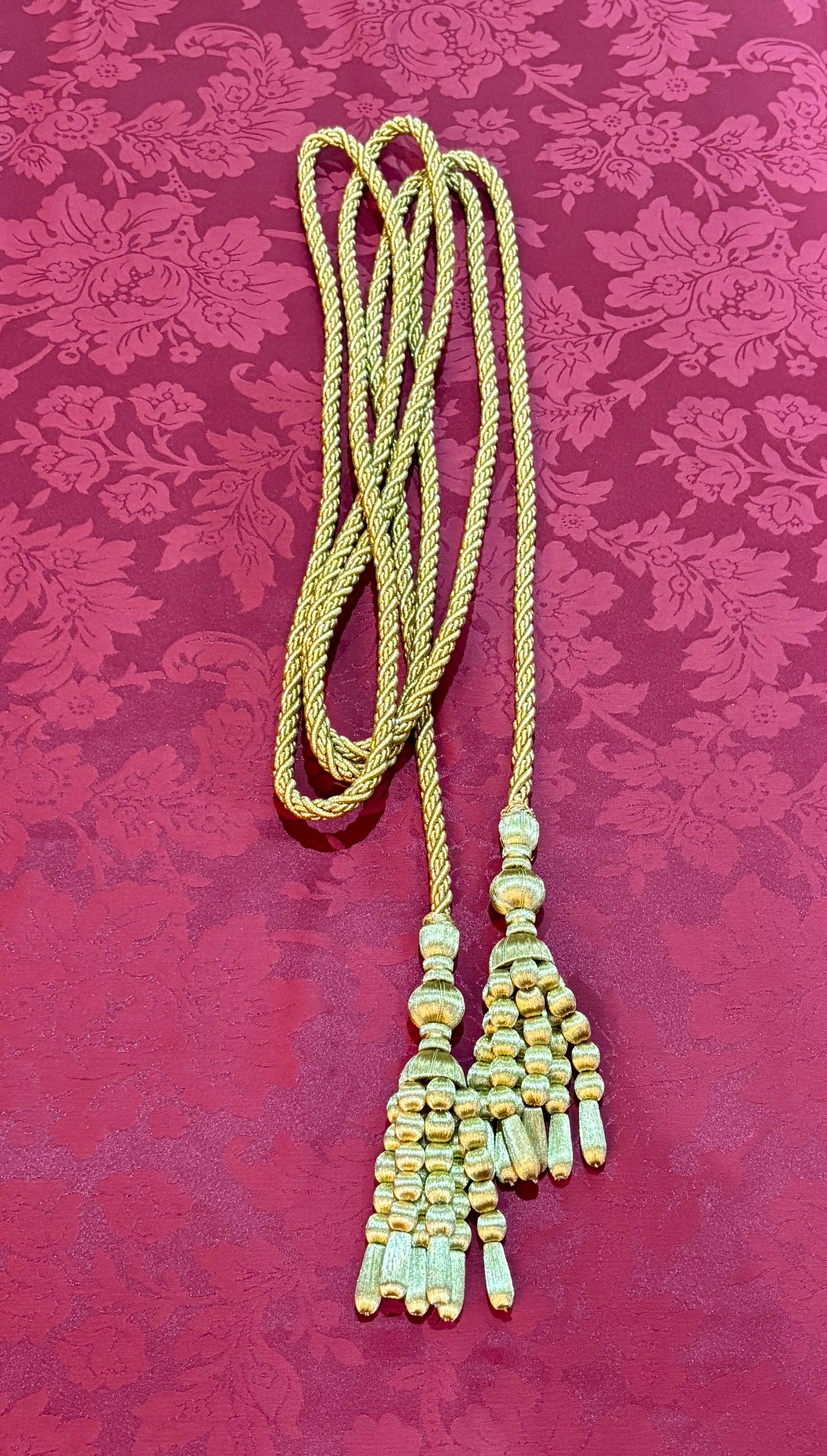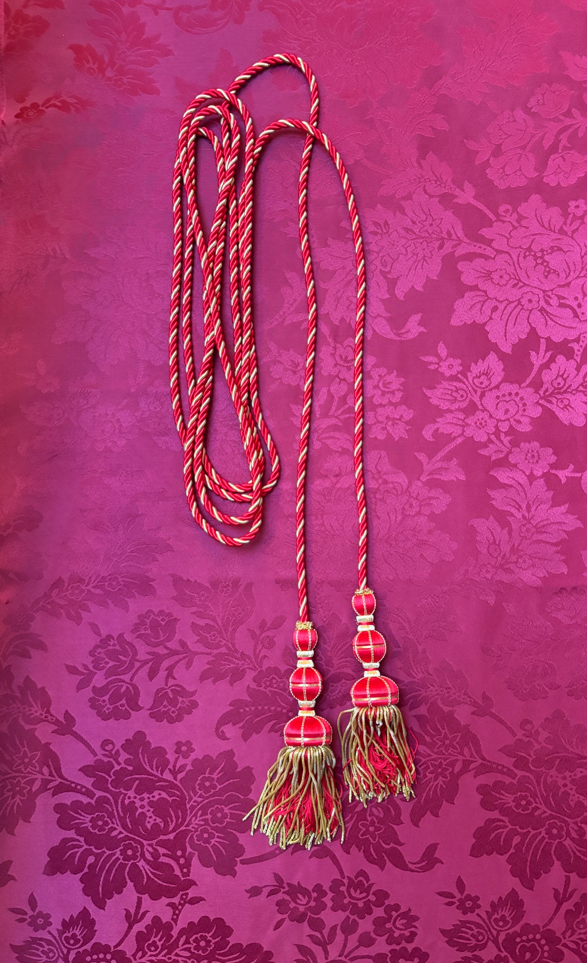 - De seda azul y oro entrefino con borlas doradas de fleco torcido. Fue donado por una devota de la imagen.