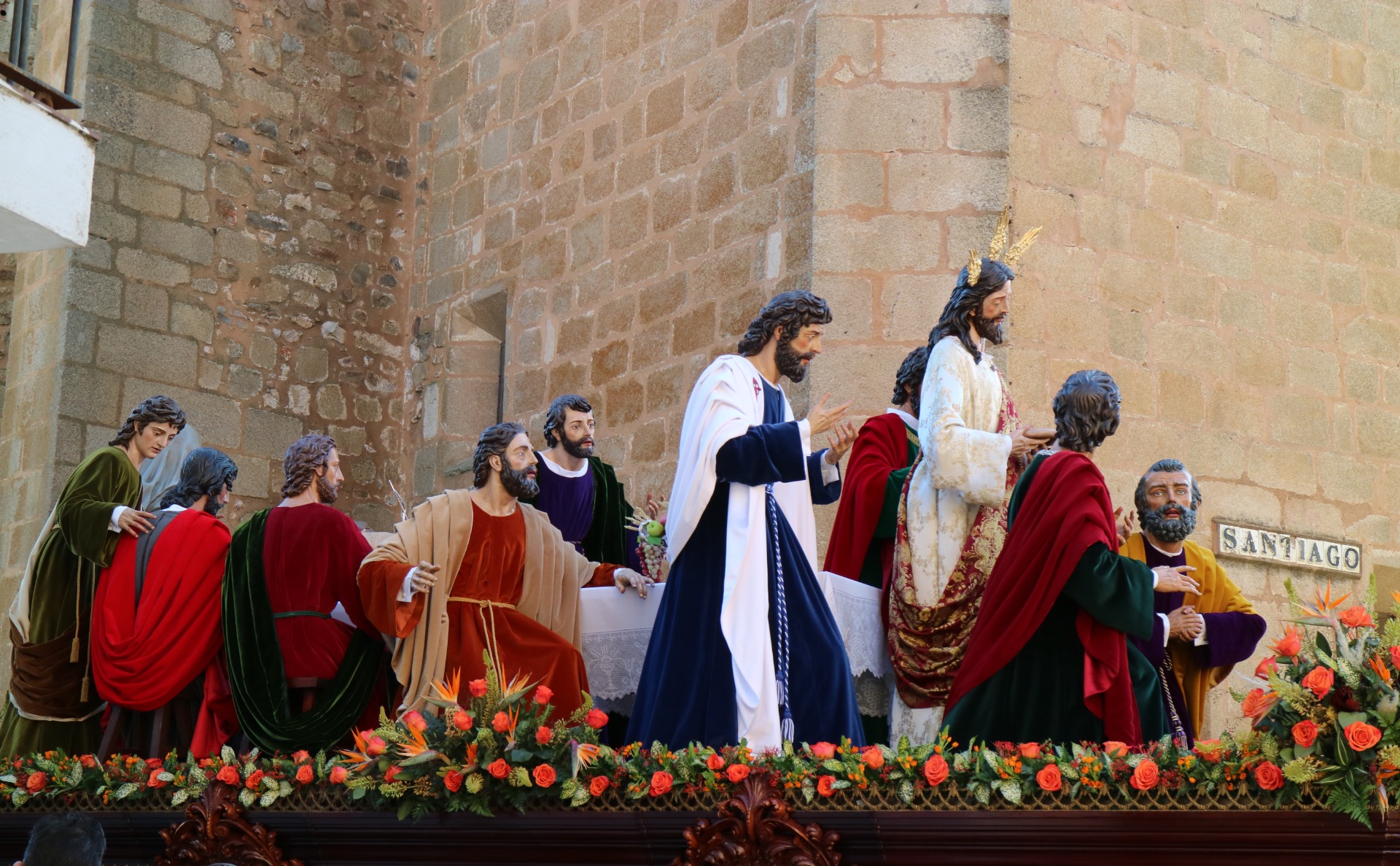 La procesión parte del templo de Santiago a las 11:00 horas con el siguiente itinerario: Santiago, Godoy, Zapatería, plaza del Duque, Gabriel y Galán, plaza Mayor, Pintores, plaza de San Juan, San Pedro, Donoso Cortés, Roso de Luna, plaza de San Juan, Gran Vía, plaza Mayor, Gabriel y Galán, plaza del Duque, Zapatería, Godoy y Santiago (donde tiene lugar el entrañable encuentro entre los tres pasos al son de la marcha "La Saeta").