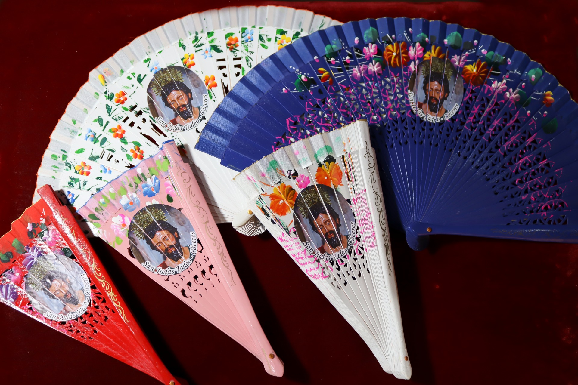 Surtido de abanicos de diferentes colores en dos tamaños. En todos ellos va la foto de san Judas Tadeo.