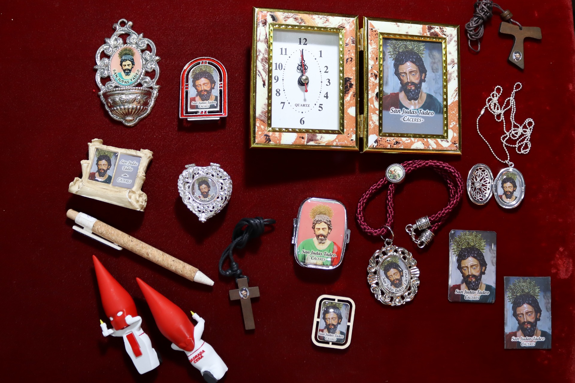 Amplio surtido de diferentes artículos de regalo como colgantes, pastilleros, imanes para neveras, benditeras, capillas, relojes, bolígrafos, mecheros, medallas, placas para los coches y un largo etcétera. Cada uno de ellos viene con la foto o la medalla de san Judas Tadeo.