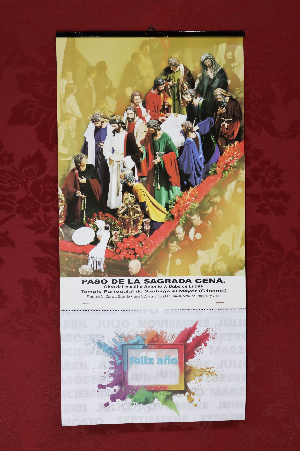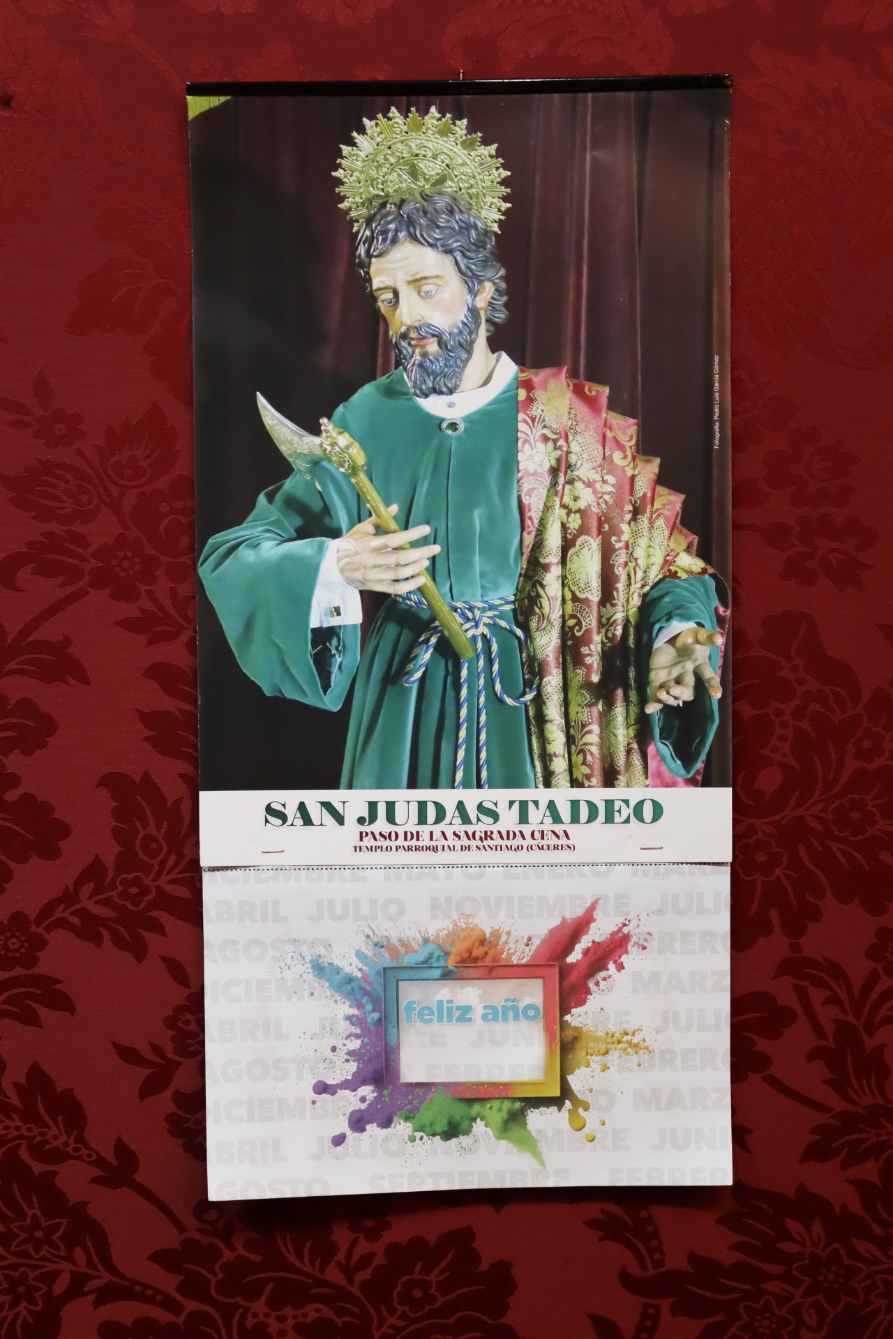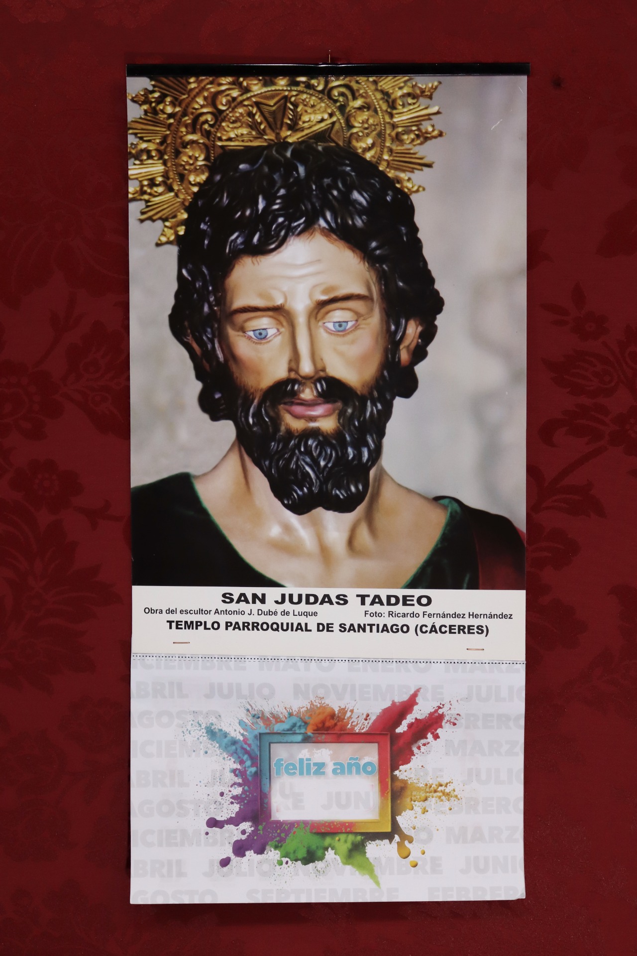 Calendarios de pared con las láminas de san Judas Tadeo, el paso de la Sagrada Cena, el Señor de la Eucaristía, Nuestra Señora del Sagrario y el Cordero Pascual.