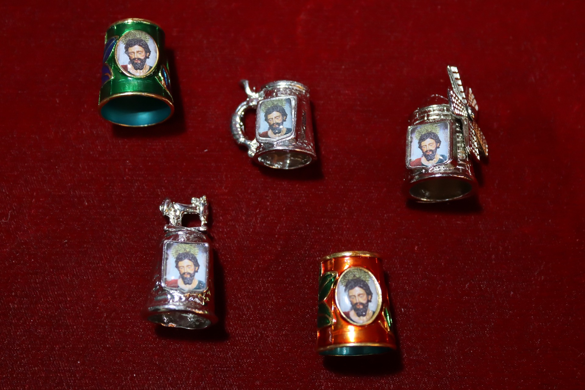 Con diferentes modelos en metal y esmaltados con la foto de san Judas.