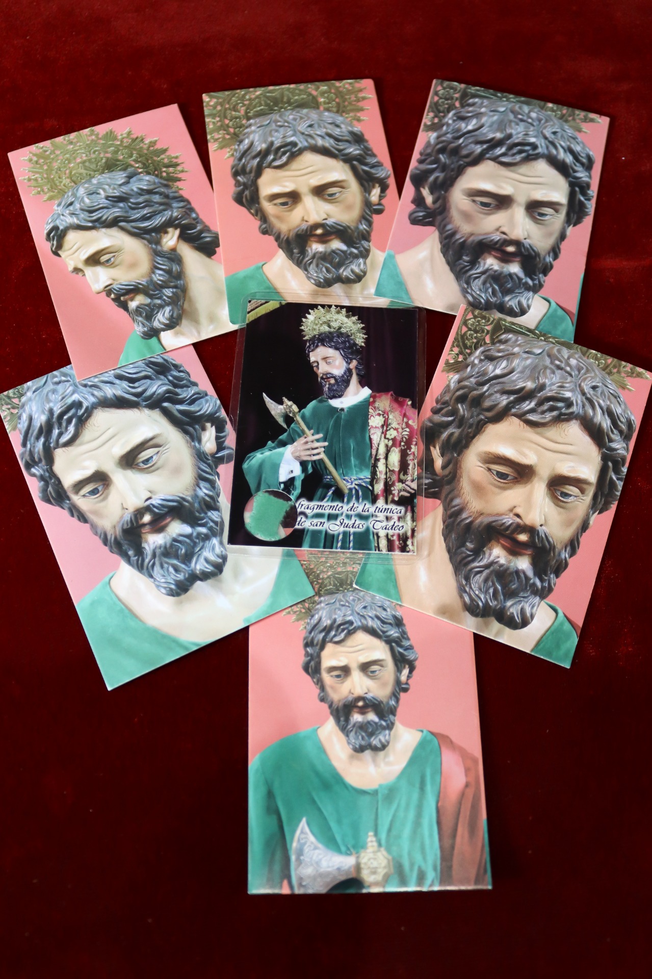 Estampas de san Judas Tadeo con su oración en la parte posterior. Además, también tenemos la estampa-reliquia con un fragmento de la túnica con la que se bendijo la imagen del apóstol, que incluye además la oración. También disponemos de estampas del Señor de la Eucaristía y de Nuestra Señora del Sagrario.