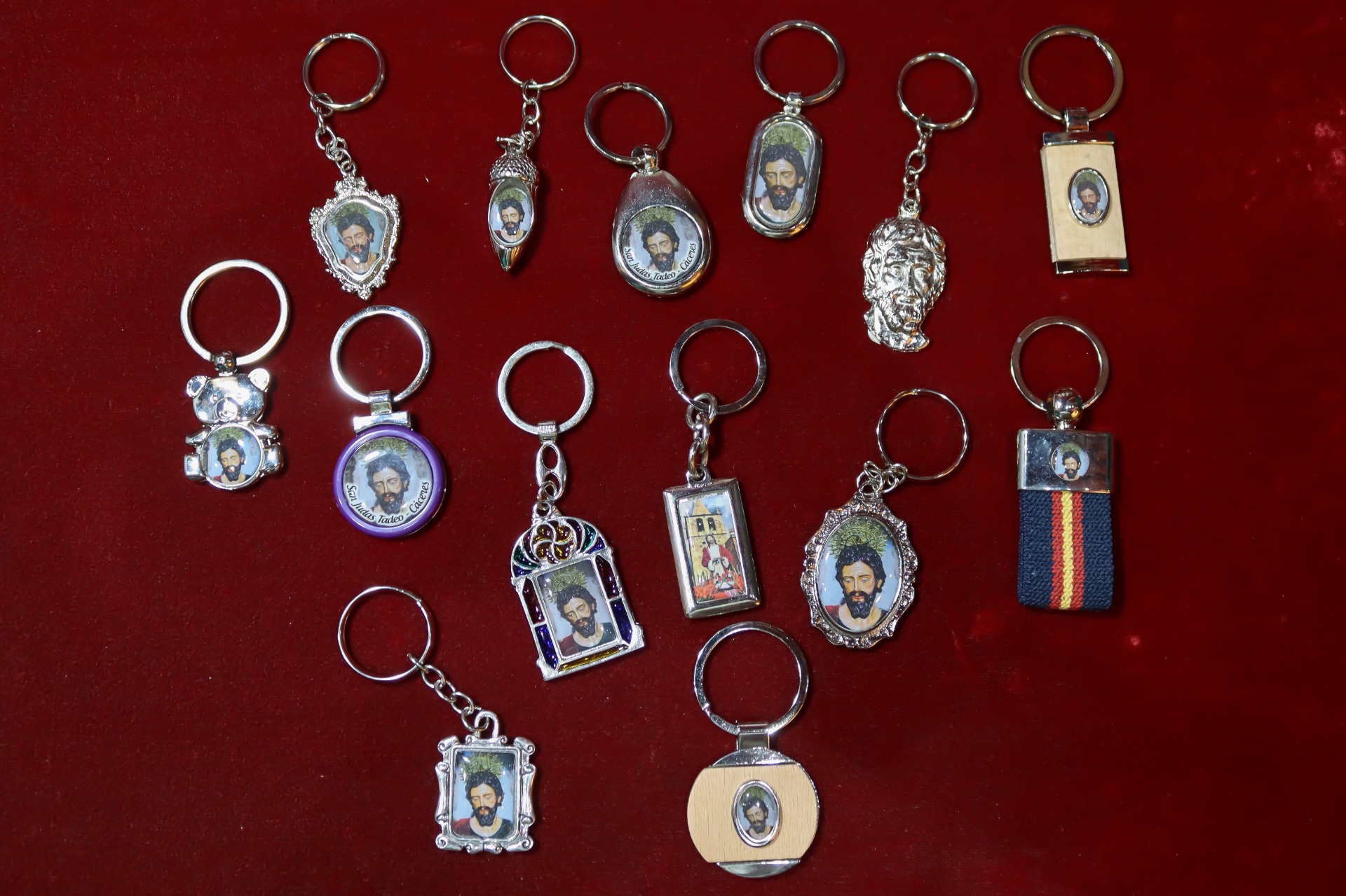 Variedad notable de llaveros en acero, metal, madera o de nylon con diferentes formas y acabados. En ellos aparecen los rostros de San Judas Tadeo, el Señor de la Eucaristía o Nuestra Señora del Sagrario.