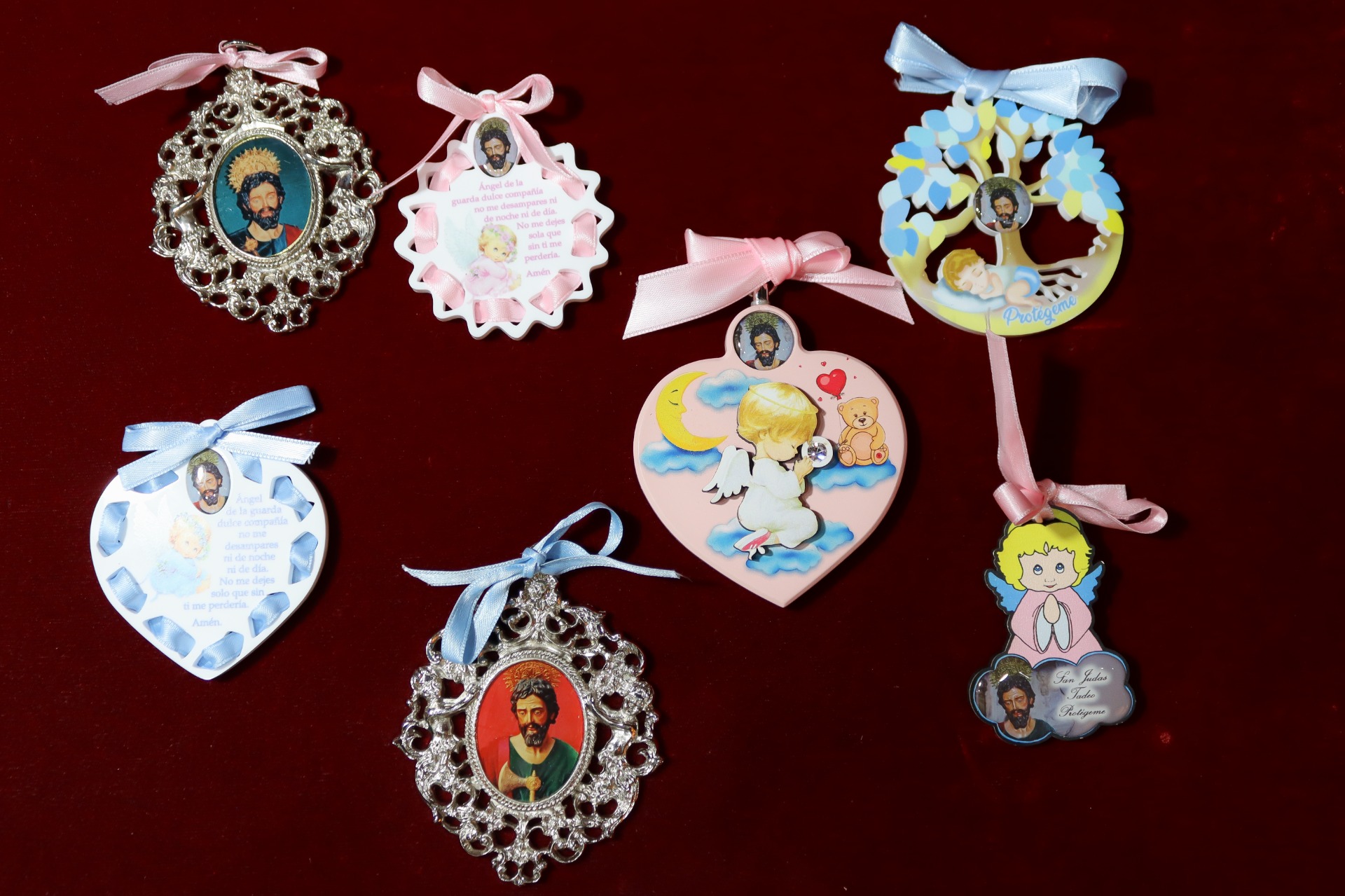 Con preciosos diseños infantiles que incluyen el rostro de san Judas Tadeo. Realizados en metal, madera o plástico y todos con su lazo de seda de color azul o rosa.