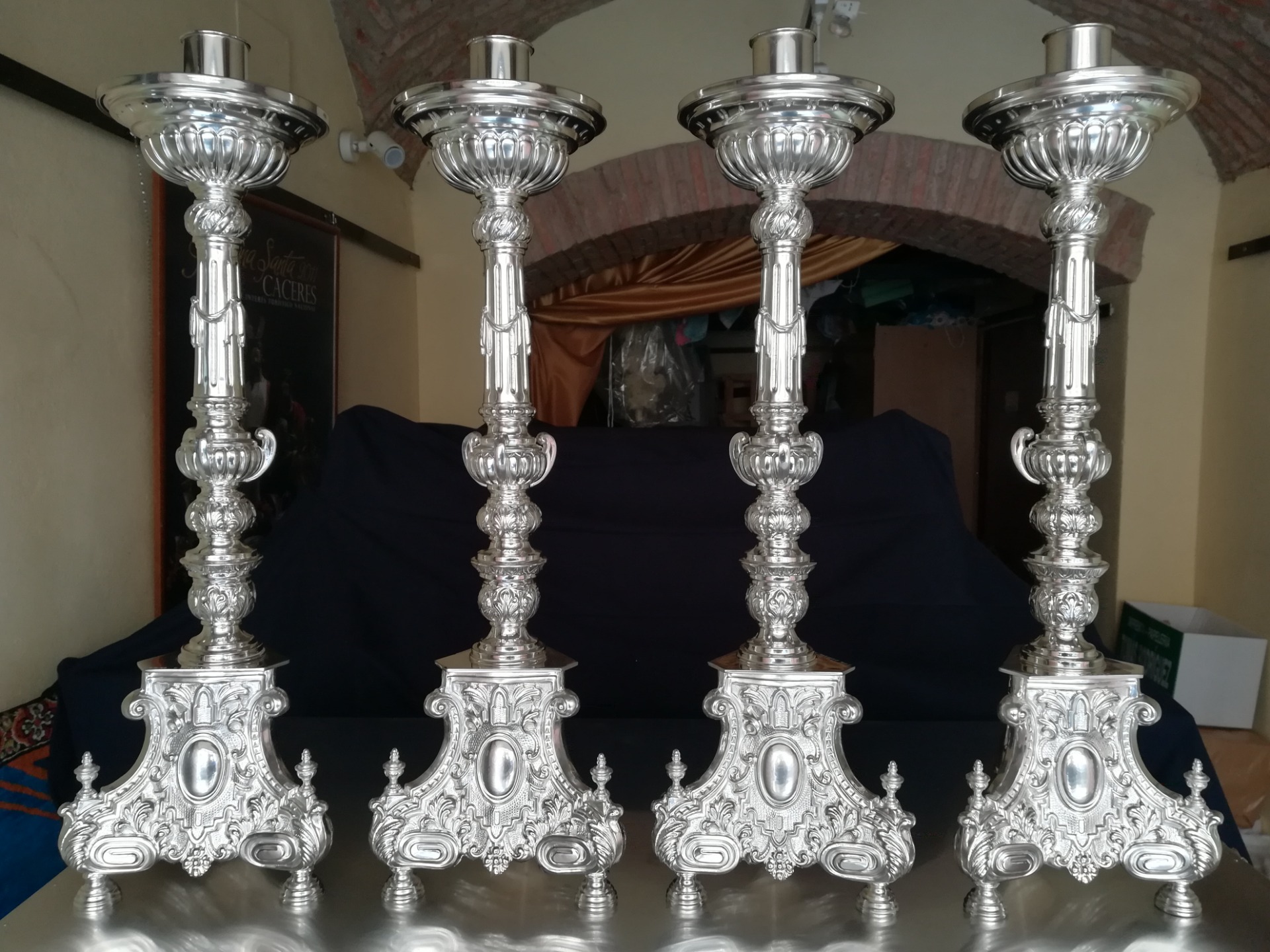Estos candelabros siguen un diseño renacentista basado en las dos grandes columnas del retablo mayor de la parroquia de Santiago, ideado por el genio de Alonso Berruguete en 1557. Constan de una base formada por tres caras trapezoidales articuladas a partir de una cartela central formada por cueros recortados y ornamentación vegetal que contienen el anagrama de la Virgen, la custodia en alusión a la cofradía y una venera con la cruz de Santiago. Esas caras quedan enmarcadas por volutas en forma de S invertida, con el remate inferior, del que parten las patas, más desarrollado.